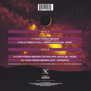 B2Far From Gemini (E.P. Version) This very hard to find sleeper has never been on vinyl before now! Additionally, it has undergone major construction/deconstruction by DJ extraordinaire, Manuel Rios, who has taken a great amount of care in creating two amazing remixes (both over 7 minutes!) for the original song, included here, which clocks in at just over 3 minutes. The "Italo Disco Full Remix" is completely DJ friendly with full intro beats, break at about 4:15 for easy in or out, mostly instrumental after the break, but the chorus comes in again before the end with very cool vocal overlays which also appear in the "Intro Mix". The latter has a softer pretty entrance before the beats come in, but very similar structure with a break around the same place being DJ friendly. The vocal overlays are more prominent in the "Intro Mix". Once again, the integrity of the original song has been preserved within the remixes with seemingly no additional production, which, when you listen to the original, you can tell must have taken quite a bit of time and effort my Mr. Rios. Kudos!! The hook on the chorus will remain with you as will some of the keyboard portions of the song. The vocal is uniquely distinct with an alternative flavor.